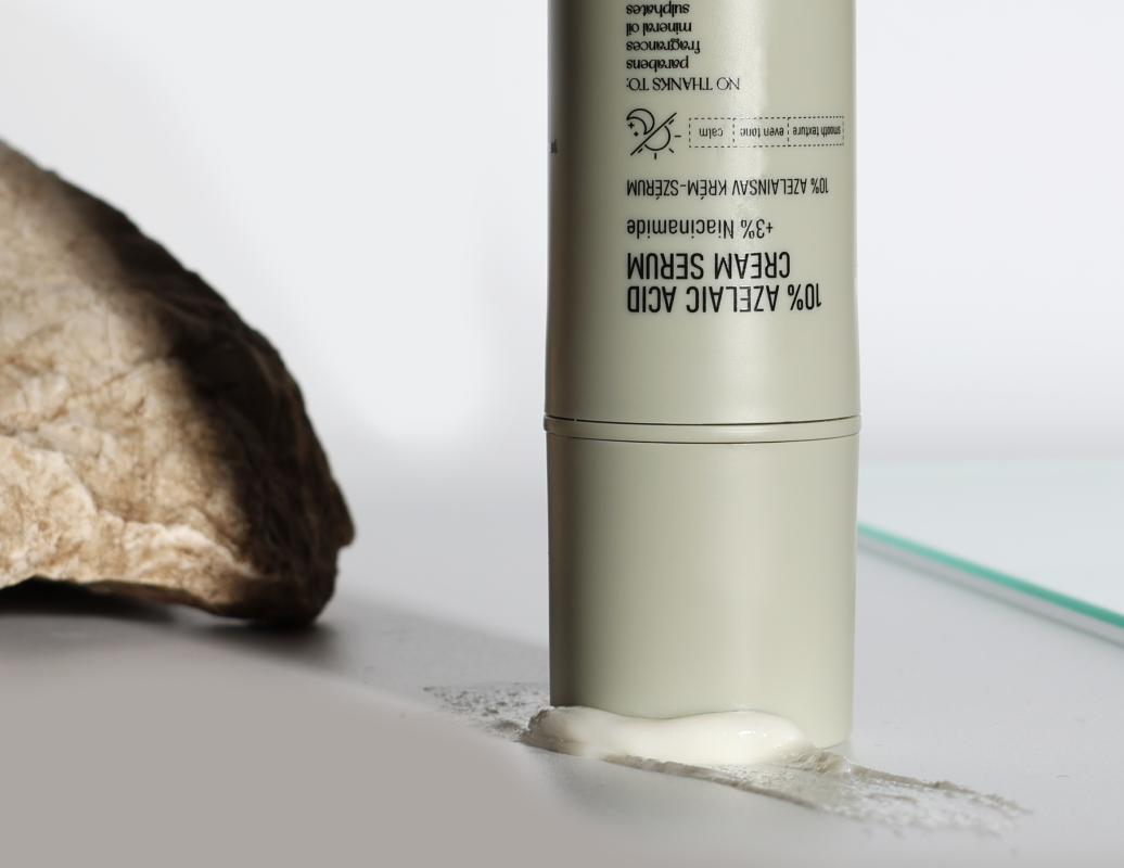 Kwas azelainowy (10%) to kluczowy składnik aktywny o działaniu przeciwzapalnym, przeciwbakteryjnym i keratolitycznym – łagodnie złuszcza martwe komórki naskórka, oczyszcza pory i zapobiega ich ponownemu zapychaniu. Niacynamid (witamina B3) wspiera barierę hydrolipidową skóry, ogranicza nadmierną produkcję sebum i rozjaśnia przebarwienia.