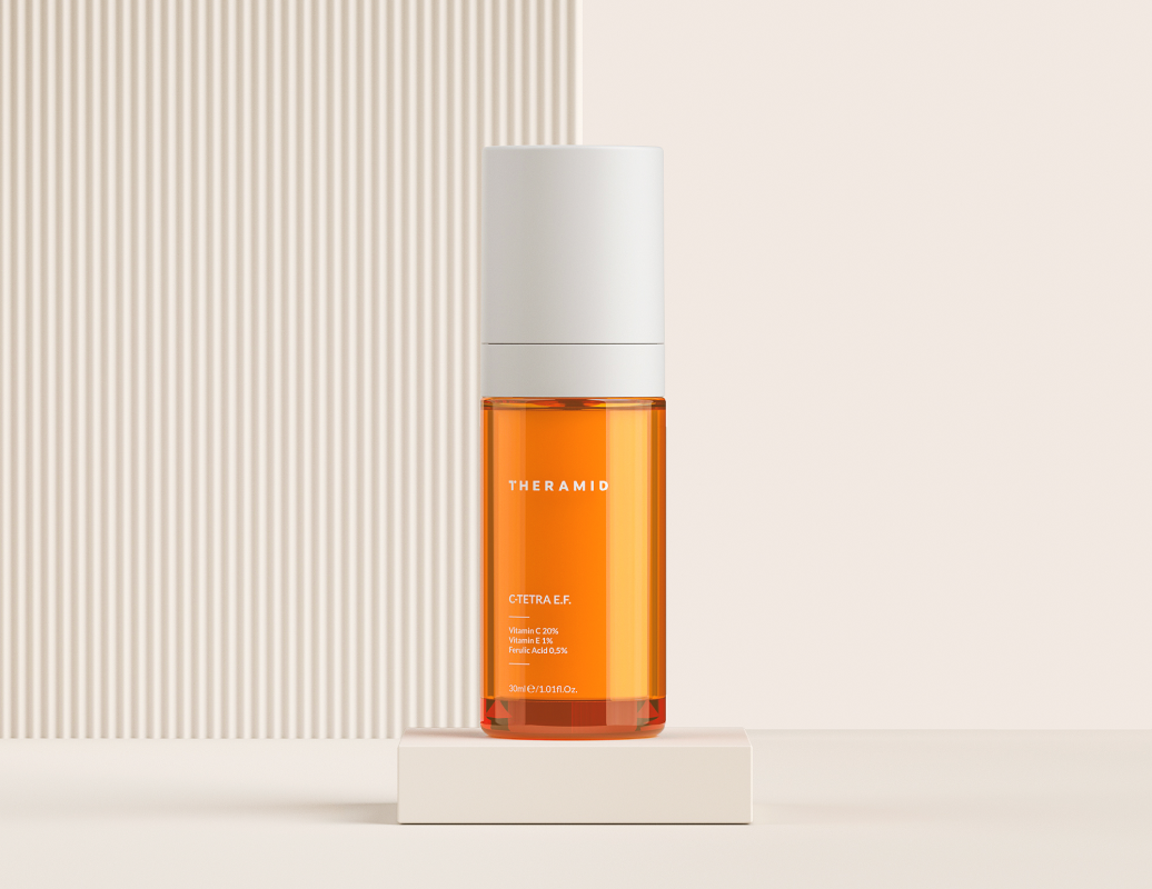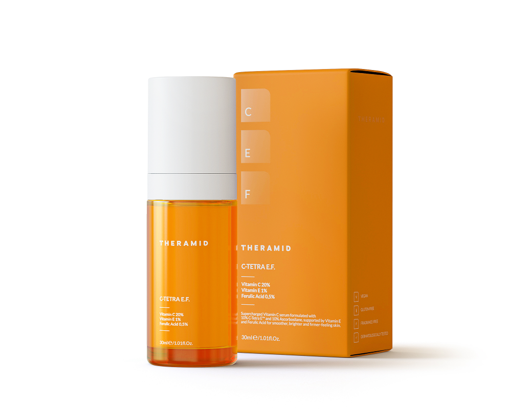 TETRAMID C.E.F. zawiera 10% witaminy C-Tetra, która jest wysoce biokompatybilna i rozpuszczalna w tłuszczach. Fakt, że jest ona rozpuszczalna w tłuszczach, umożliwia transport tego typu witaminy C do najgłębszych warstw skóry. Tutaj jej działanie koncentruje się na melanocytach (redukcja przebarwień od wewnątrz) oraz syntezie kolagenu (w zapobieganiu i zwalczaniu zmarszczek). Formułę uzupełnia Ascorbyl Methylsilanol Pectinate oraz Ascorbyl Glucoside, dwie bardzo stabilne i rozpuszczalne w wodzie pochodne witaminy C. Działają one na powierzchni skóry, nadając jej blask i redukując najczęstsze niedoskonałości.
